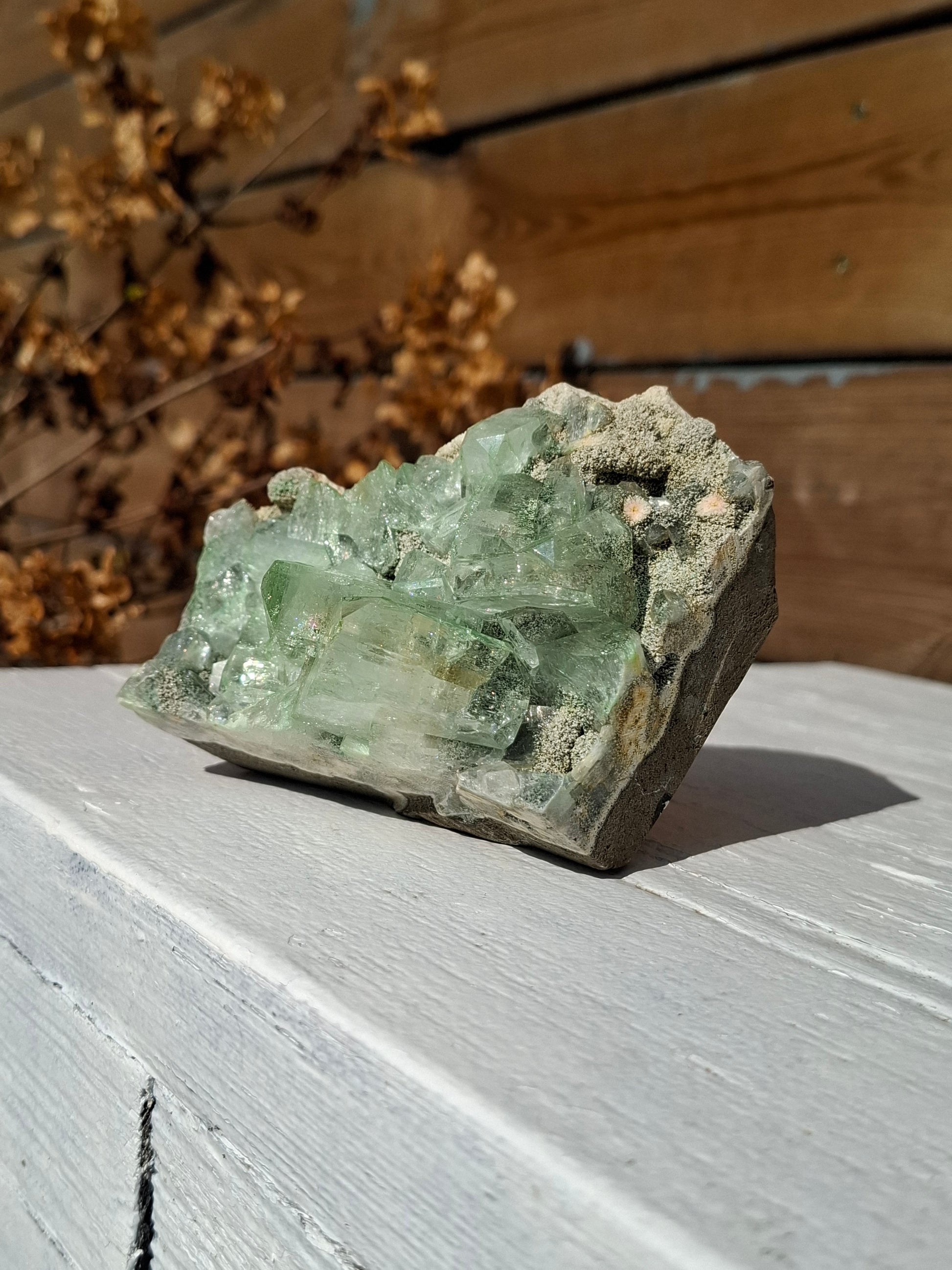 Onzettend mooie en grote apofyliet cluster met een mooie kleur groen + veel prisma's