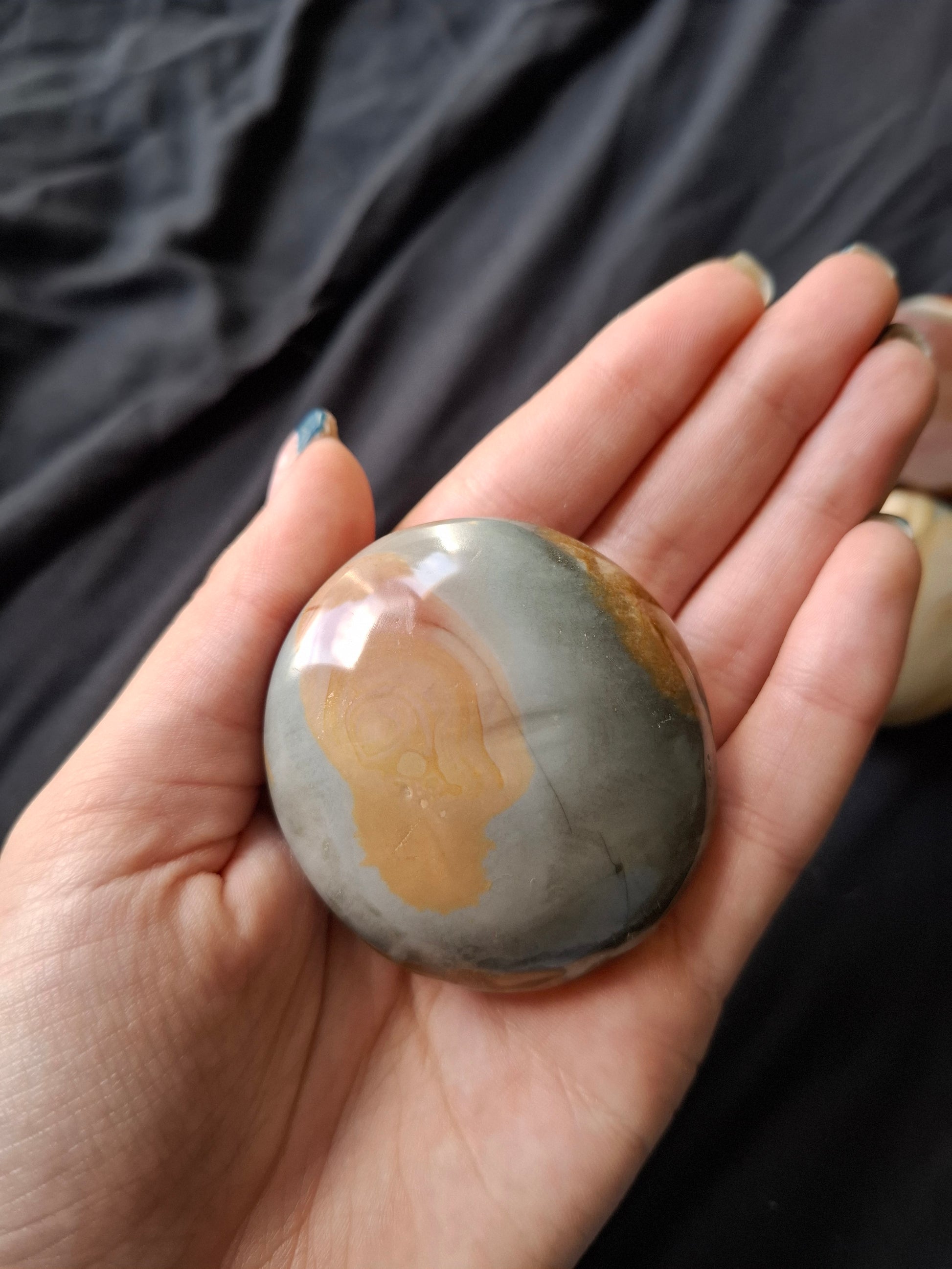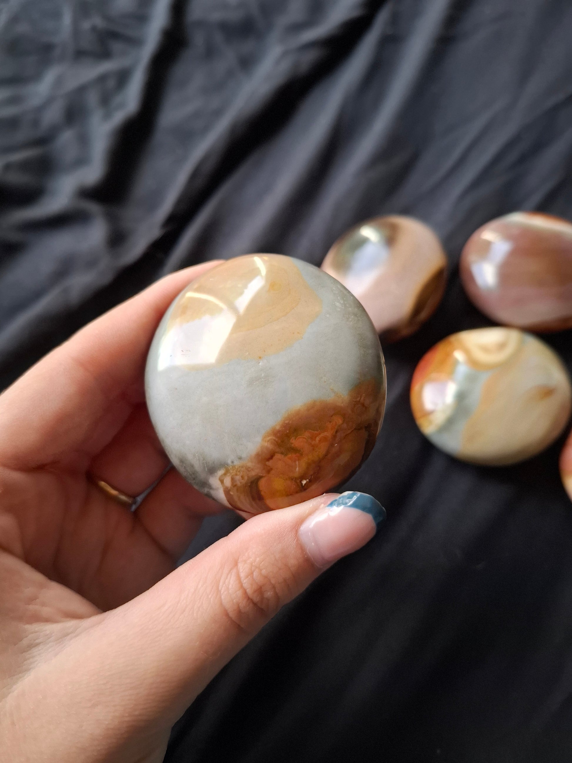 Polychroom jaspis, ook wel woestijnjaspis genoemd, is een kleurrijke edelsteen met warme tinten zoals rood, oranje, beige en blauwgrijs. Elke handsteen is uniek door de bijzondere patronen en kleurschakeringen. Deze steen staat bekend om zijn aardende en beschermende energie, brengt balans en versterkt vitaliteit. Ideaal om bij je te dragen of in je ruimte neer te leggen als krachtig decoratief stuk