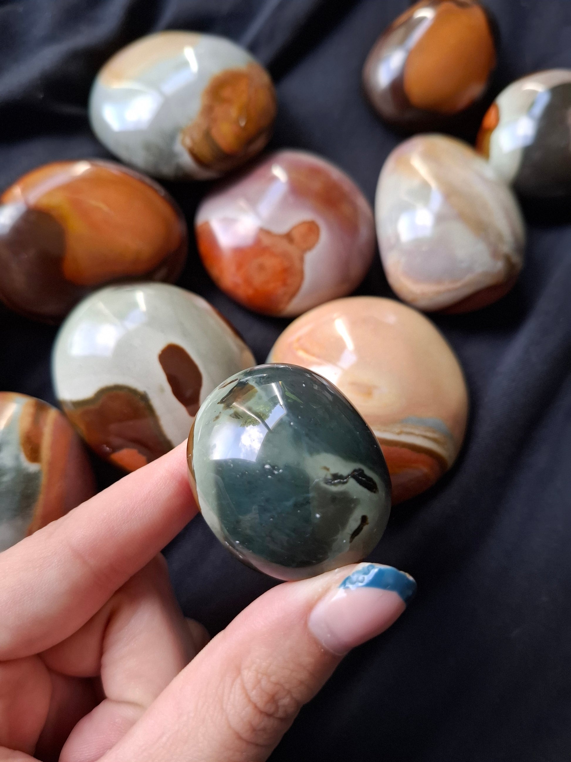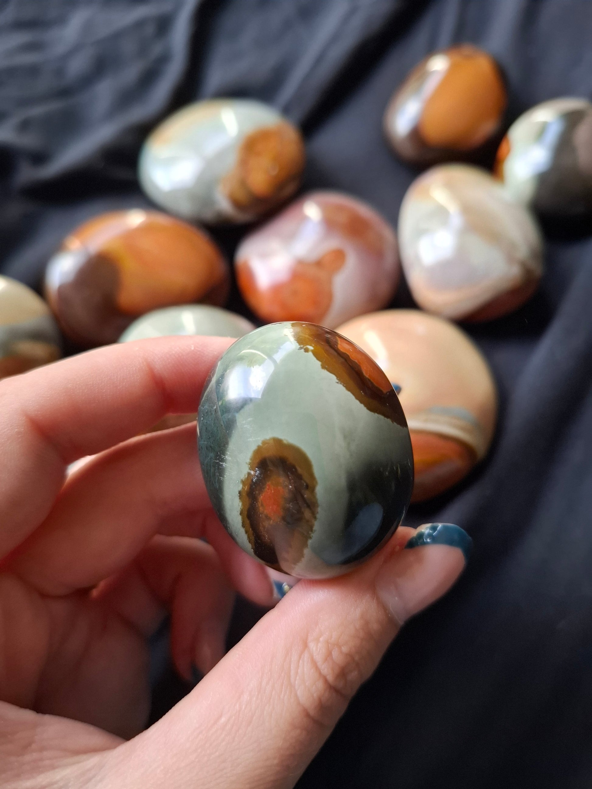 Polychroom jaspis, ook wel woestijnjaspis genoemd, is een kleurrijke edelsteen met warme tinten zoals rood, oranje, beige en blauwgrijs. Elke handsteen is uniek door de bijzondere patronen en kleurschakeringen. Deze steen staat bekend om zijn aardende en beschermende energie, brengt balans en versterkt vitaliteit. Ideaal om bij je te dragen of in je ruimte neer te leggen als krachtig decoratief stuk