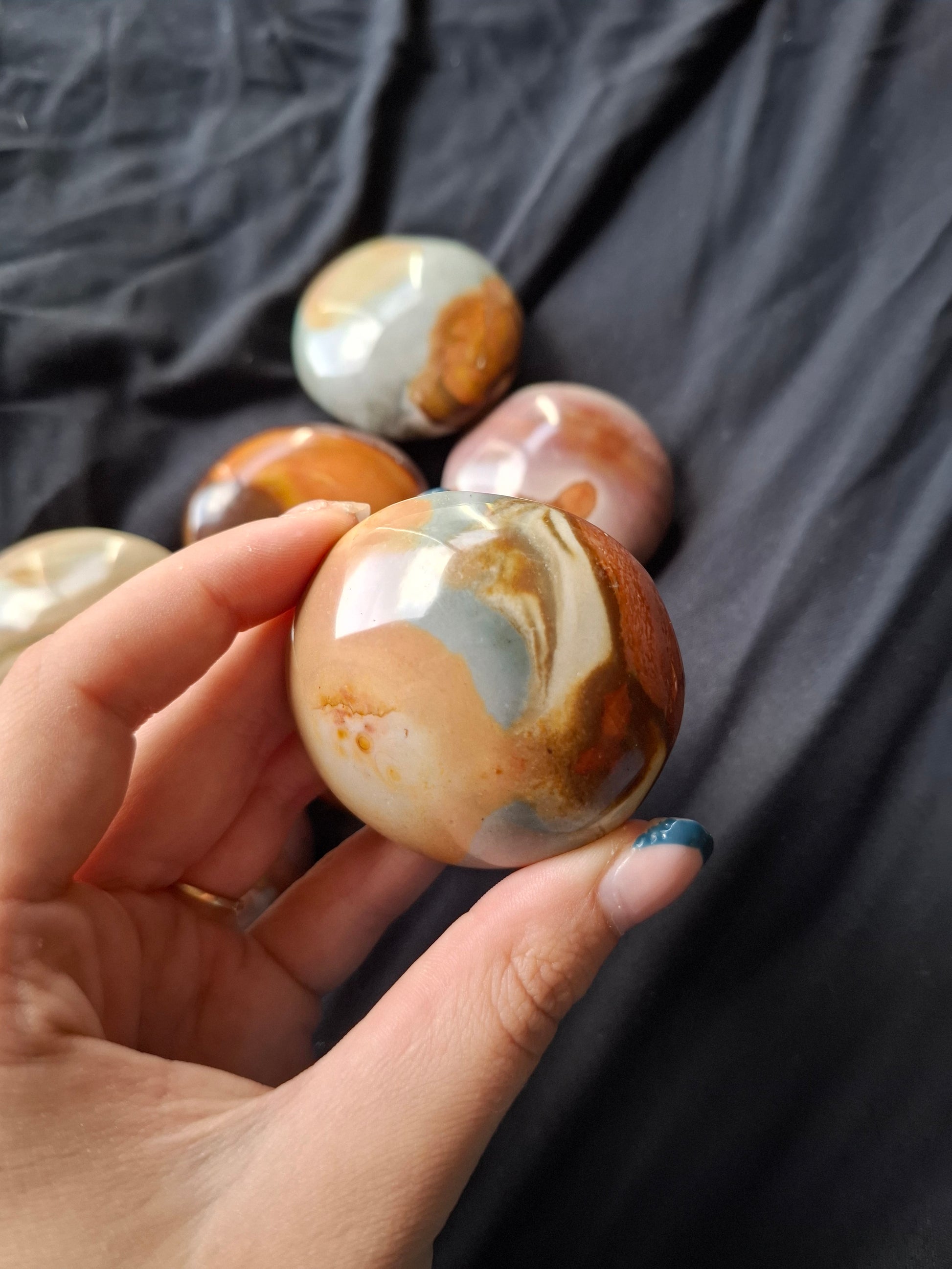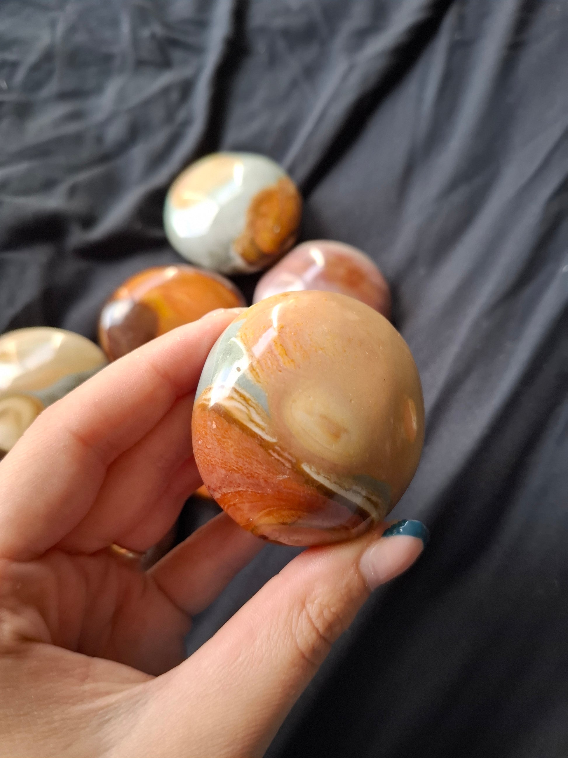 Polychroom jaspis, ook wel woestijnjaspis genoemd, is een kleurrijke edelsteen met warme tinten zoals rood, oranje, beige en blauwgrijs. Elke handsteen is uniek door de bijzondere patronen en kleurschakeringen. Deze steen staat bekend om zijn aardende en beschermende energie, brengt balans en versterkt vitaliteit. Ideaal om bij je te dragen of in je ruimte neer te leggen als krachtig decoratief stuk