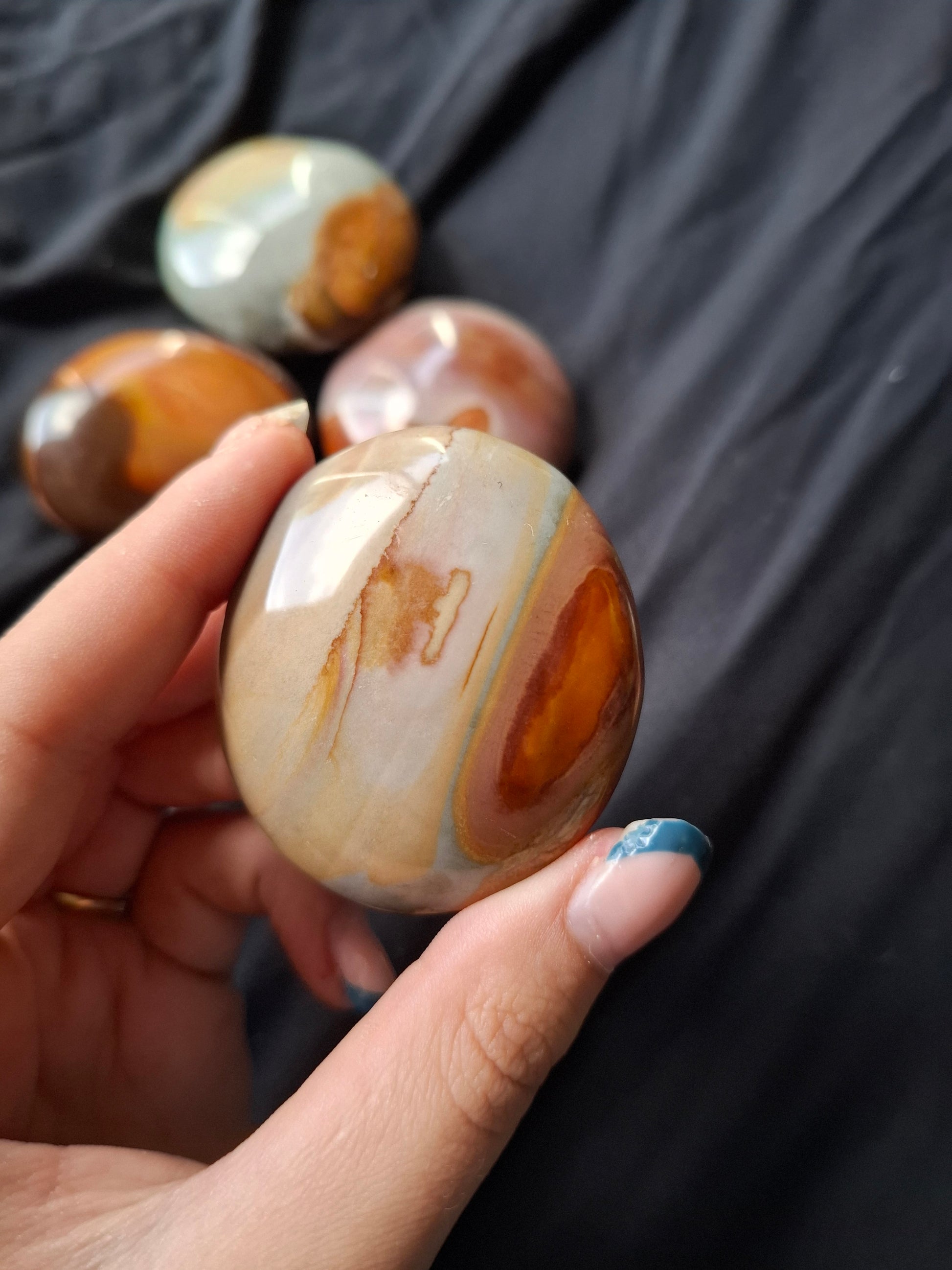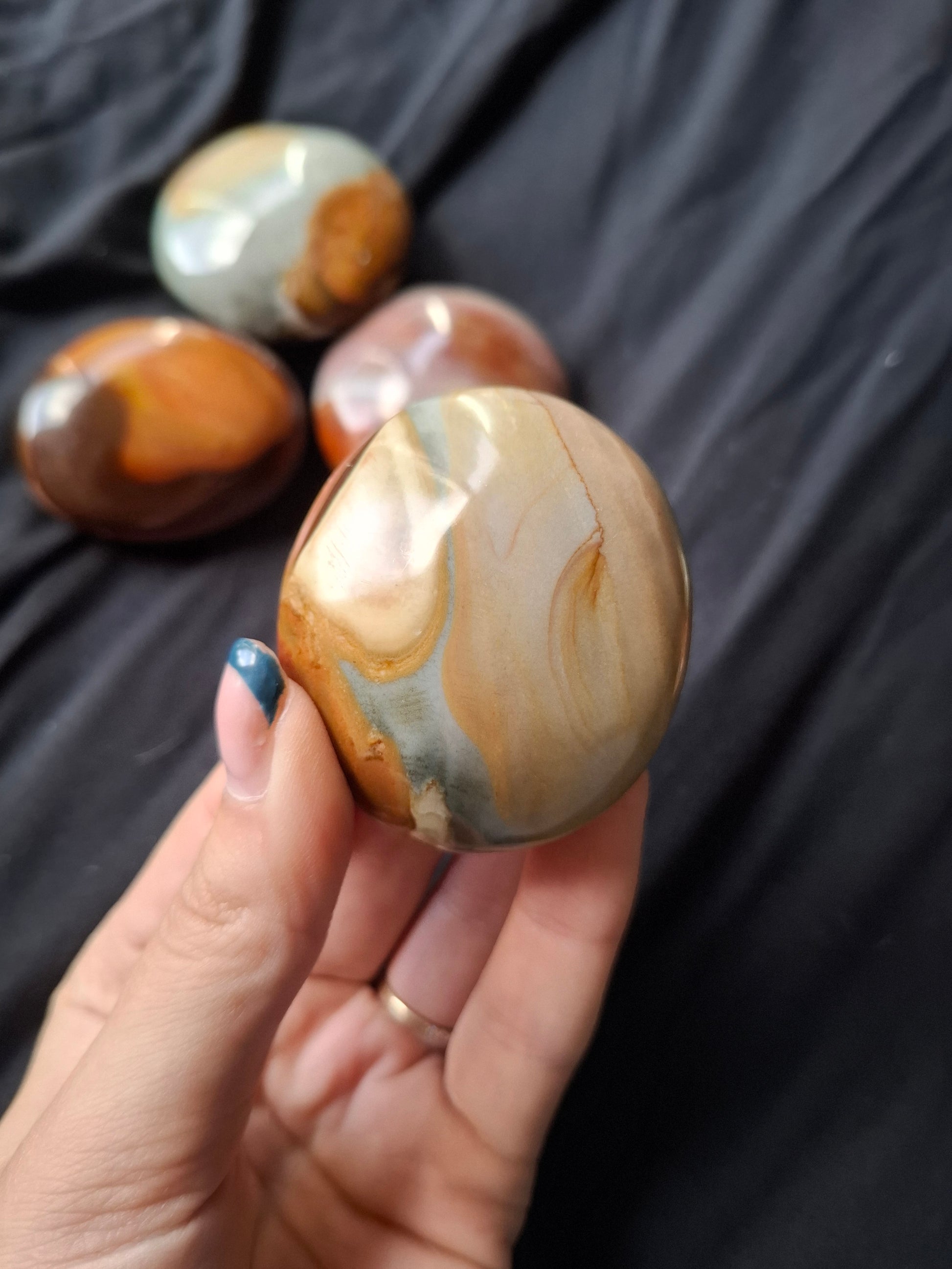 Polychroom jaspis, ook wel woestijnjaspis genoemd, is een kleurrijke edelsteen met warme tinten zoals rood, oranje, beige en blauwgrijs. Elke handsteen is uniek door de bijzondere patronen en kleurschakeringen. Deze steen staat bekend om zijn aardende en beschermende energie, brengt balans en versterkt vitaliteit. Ideaal om bij je te dragen of in je ruimte neer te leggen als krachtig decoratief stuk